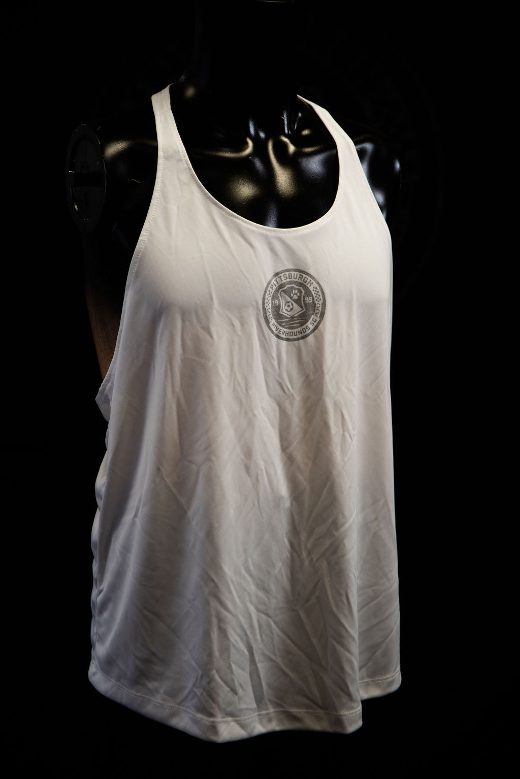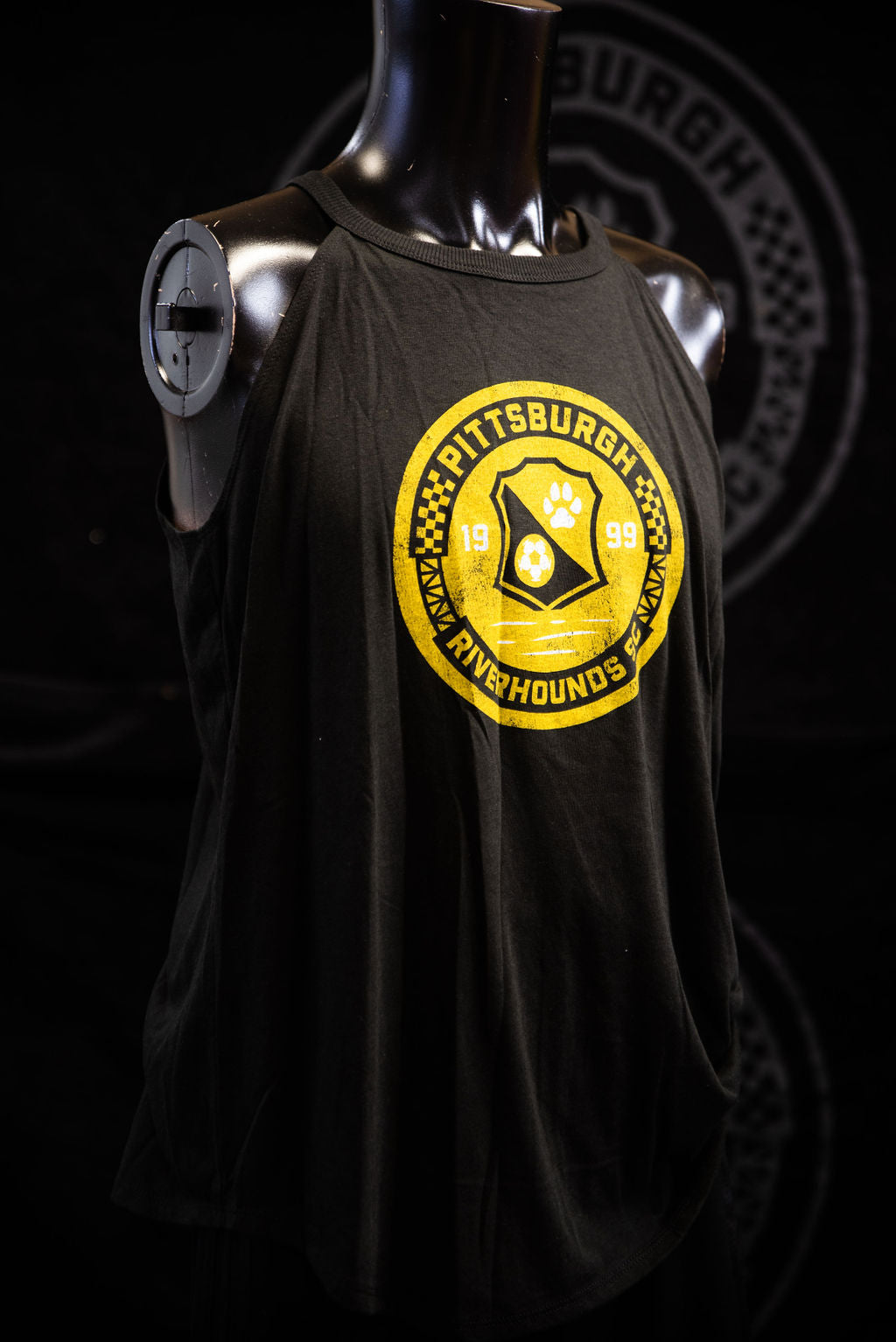 Ladies Tanks available in various styles and prices. Ladie's Black Tank Top with Script River Hounds, a distressed gold Pittsburgh Riverhounds SC Badge, light gray with black badge and heathered gray with Riverhounds Banner.